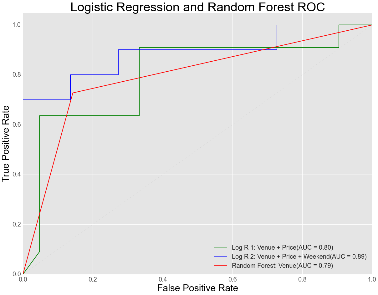 Due to the relative small size of my data set I was able to test many machine learning models and feature spaces. As you can see below the best performer was the logistic regression classifier using only the 27 venues and price as features.